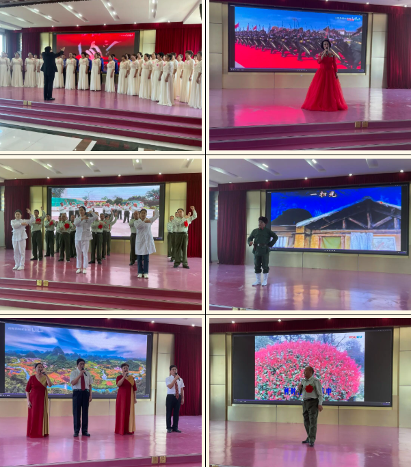 伴随着大合唱《映山红》沉郁抒情的歌声,人们的思绪被拉回到那个激荡人心的红色峥嵘岁月,演出正式拉开帷幕。整场演出祖国元素满满,萨克斯独奏《我的祖国》、男女声四重唱《我的家在中国》、现代京剧《智取威虎山》选段“祖国的好山河寸土不让”,用优美的曲调和嘹亮的歌声表达人们对祖国母亲深深眷恋和浓浓祝福。疗养荣军与医务人员联袂演出的拥军秧歌、歌曲联唱,展现浓郁军旅情怀,赞美幸福休养生活。舞蹈、萨克斯重奏、葫芦丝独奏、诗朗诵、黄梅戏等艺术形式轮番上演、精彩纷呈,更有女声独唱《祝福祖国》烘托节日气氛、献礼伟大祖国,将演出推向高潮。