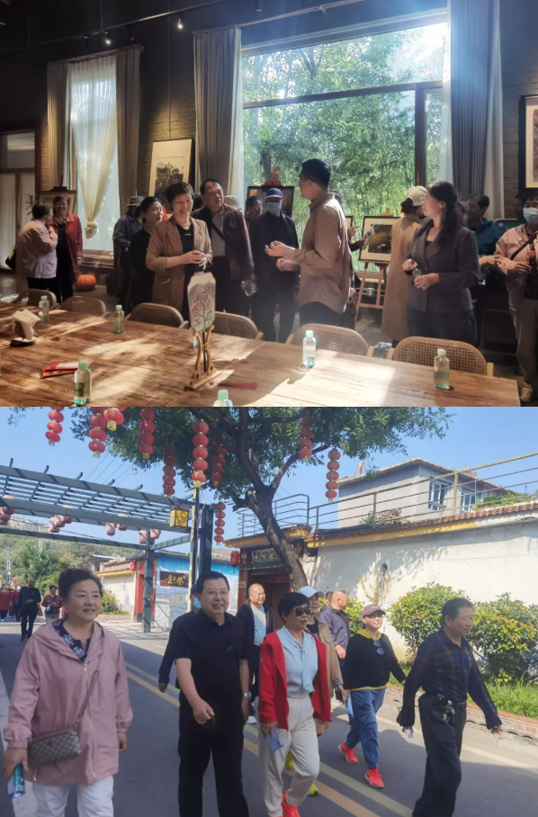 在王家辇村活动结束之后,一行人兴致勃勃的走进了凤凰引村。凤凰引民宿艺术村是在原始废弃的老村落原址上改造修建,村落的每一个角落都展现齐文化的图案和艺术装置,细致的设计和艺术的植入点亮乡村,让废弃的老村落得以凤凰涅槃重生。每到一处都令老同志们赞叹连连,纷纷在这些特色建筑前拍照留念。一路上,老同志们三三两两相互结伴,欣赏着特色浓郁的各式景观,热情高涨。