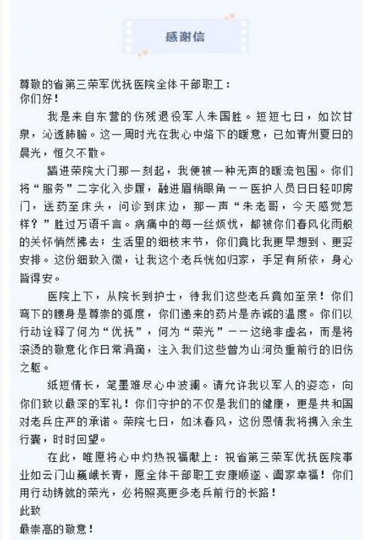 “你们弯下的腰身是尊崇的弧度;你们递来的药片是赤诚的温度……你们用行动诠释了何为优抚,何为荣光”。这是优抚对象朱国胜感谢信中提到的一句话,质朴的话语道出了优抚对象对医院优质服务的高度肯定和极大褒奖。