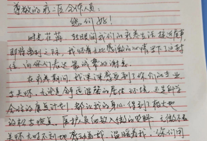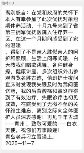 离别在即,不舍之情溢于言表,荣军们以最质朴最真挚的方式,向医院传递心中的感激。一封封手写的感谢信,字里行间满是“服务贴心、关怀暖心”的赞誉;一面面镌刻着“医术精湛护荣军 医德高尚传美名”的锦旗,承载着对医院服务的认可与敬意;留言簿上,一句句“感恩国家关怀,感谢医院守护”的祝福,质朴却动人;荣军专属微信群里,持续刷屏感谢与不舍,让跨越距离的温情从未间断。