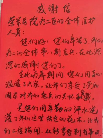 离别之际,荣军们以手写感谢信、赠送锦旗等质朴方式致谢,专属微信群里感恩话语持续刷屏,字里行间满是不舍与认可,彰显深厚军民情谊。