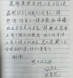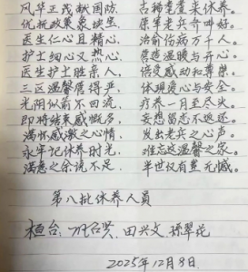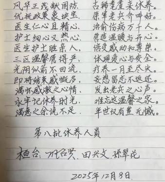 时光荏苒,温情相伴的疗养时光接近尾声。离院之际,两位老人戴上老花镜,一笔一划写下饱含深情的感言。“你们用亲人般的关爱,给予了我们家的温暖”,字里行间满是对医院优质服务的真挚谢意,以质朴的话语表达了最动人的褒奖。