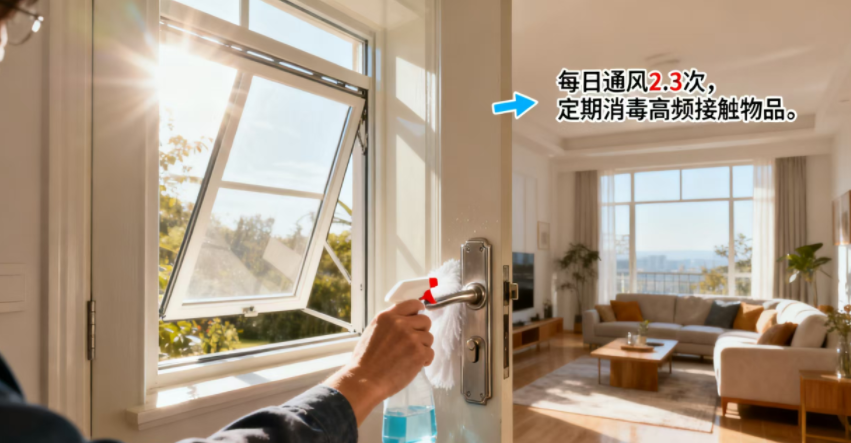 1.居家每日开窗通风2-3次,每次30分钟以上,寒冷天气可分时段通风,避免着凉,保持室内空气流通。