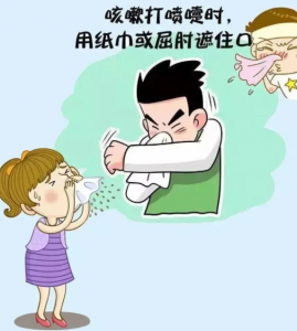 2.咳嗽、打喷嚏时用纸巾遮挡口鼻,无纸巾时用肘部代替,用过的纸巾及时扔进带盖垃圾桶,避免飞沫传播 。